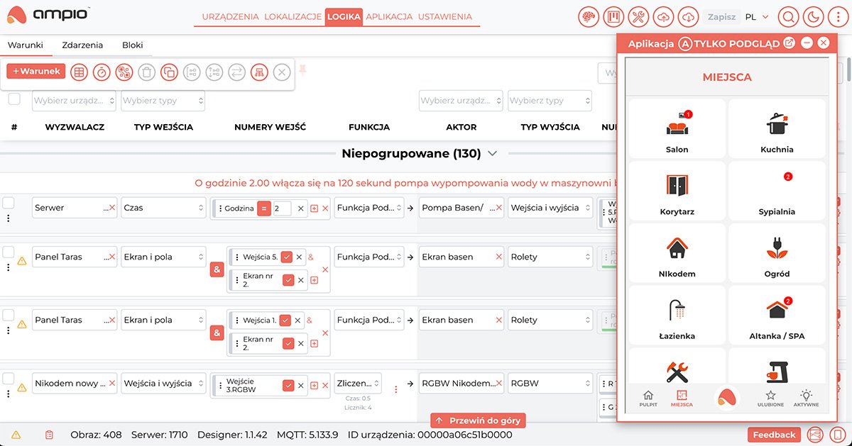 System Ampio oferuje nowoczesny i dopracowany interfejs konfiguracyjny Ampio Designer, który znacząco ułatwia pracę instalatora. Pomimo bardzo szerokich możliwości funkcjonalnych i zaawansowanej logiki, konfiguracja systemu pozostaje szybka, przejrzysta i intuicyjna.