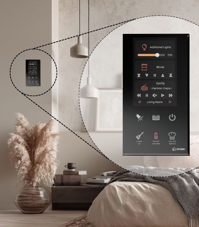 Estetyka idzie w parze z funkcjonalnością. Najbardziej rozbudowane panele Ampio umożliwiają sterowanie nawet setkami urządzeń z jednego miejsca. Zamiast ściany pełnej przełączników, pilotów i termostatów — jeden, spójny panel, który przejmuje pełną kontrolę nad budynkiem.
