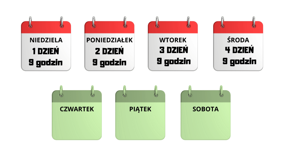 Zdajemy sobie sprawę jakim problemem dla firm instalacyjnych jest rezygnacja z całego tygodnia pracy na rzecz szkolenia. Dlatego podjęliśmy decyzję o zwiększeniu ilości dziennych godzin szkolenia do dziewięciu, na rzecz zmniejszenia ilości dni szkoleń do czterech. Szkolenia zawsze rozpoczynać będziemy też od niedzieli, dzięki czemu każdemu uczestnikowi zabierzemy tylko 3 dni pracy z tygodnia.